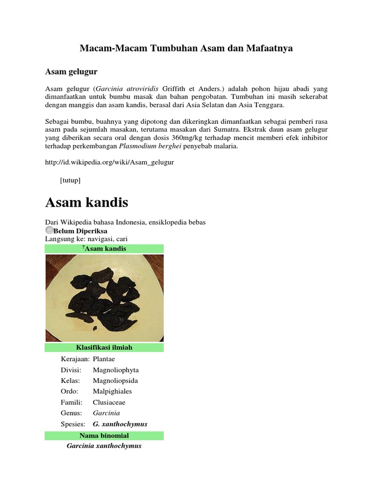Asam potong dimanfaatkan untuk bumbu masak bahan perasa minuman bahan dasar pengobatan dan bahan dasar kosmetika. Asam gelugur garcinia atroviridis griffith et anders adalah pohon penghasil asam potong atau asam keping. Sebagian masyarakat melayu pesisir mengolah buah asam. Saya tanam untul ambil pucuk sebagai ulam.