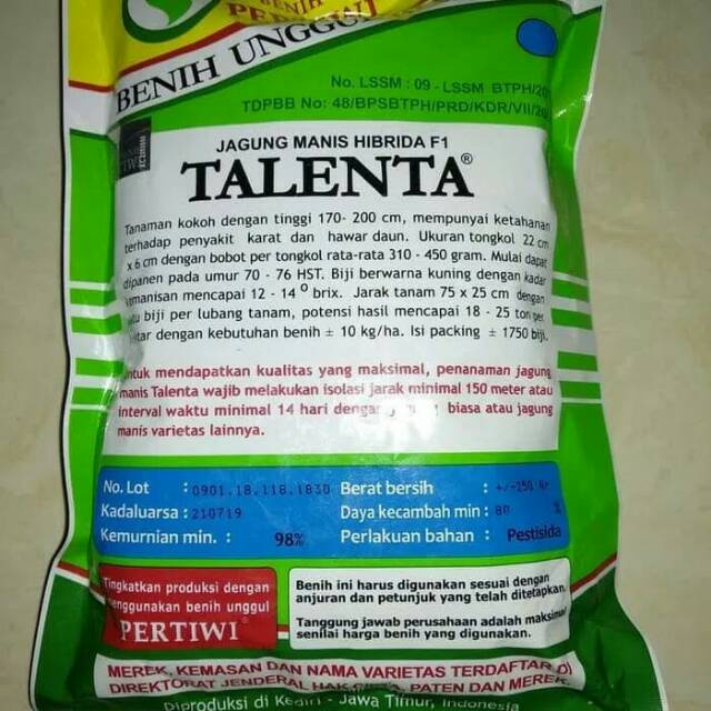 Harga talenta benih jagung manis terbaru jika anda ingin membeli talenta benih jagung manis namun masih bingung dengan harga yang ditawarkan berikut ini adalah daftar harga talenta benih jagung manis murah terbaru yang bersumber dari beberapa toko online indonesia. Jual benih jagung manis bonanza f1 hubungi 0856 4760 3608 untuk pemesanan dalam kuantitas kecil maupun besar mengirim ke seluruh indonesia dengan jne atau pos indonesia. Jagung manis termasuk tanaman pangan yang cukup menguntungkan untuk dibudidayakan di indonesia dibandingkan jenis lainnya jagung manis dinilai memiliki nilai jual lebih tinggi karena banyak dibutuhkan untuk bisnis kuliner. Jagung talenta pertiwi bahwa benih yang sek as yang di jual 75 sd 80 rb itu pada saat disemai atw ditanam banyak yg tidak tumbuh hampir 30 persent busuk padahal tanah sdh diolah dengan persiapan yg baik seperti penghamburan pupuk starter dan pengobatan.