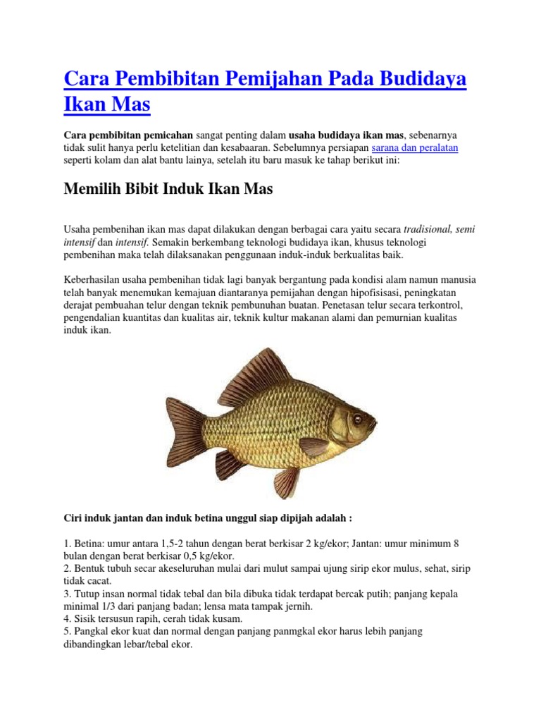 Penebaran benih ikan nila tebar benih disesuaikan dengan musim penebaran benih ikan nila pada budidaya dengan pakan alami di sesuaikan dengan keadaan musim mengingat perubahan musim yang terjadi sangat memengaruhi jumlah pakan yang tersedia. Ikanikan tersebut dapat dibedakan berdasarkan morfologinya. Ikan mas yang terdapat di indonesia merupakan ikan mas yang dibawa dari cina eropa taiwan dan jepang selain itu ikan mas punten dan ikan mas majalaya merupakan hasil seleksi di indonesia. Ikan konsumsi adalah jenis jenis ikan yang lazim dikonsumsi oleh manusia sebagai sumber pangan.